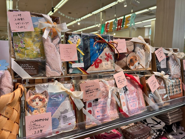 ハンカチと入浴剤やハンドクリームを組み合わせた、当店スタッフおすすめのギフトセットもご用意しています。